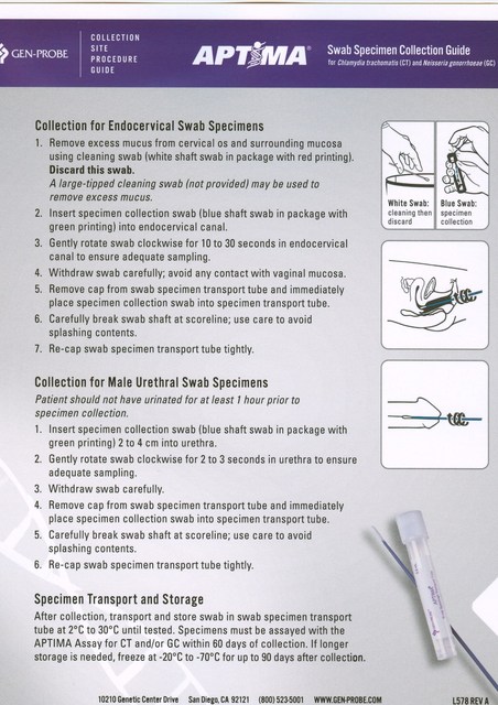 The sensitivity and specificity of CT / GC testing with the Gen-Probe APTIMA system used at LifeLabs are similar Swab Specimen Transport Tube 1. 2. Remove cap from swab transport tube Place blue shaft swab into tube Break shaft at scored line 3. ... Access Document